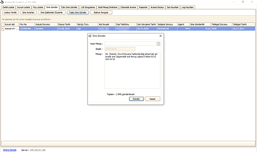 Gönderilen her SMS borçlu dosyasına Tarih, Saat, Gönderen Kişi, Alıcının Telefon Numarası ve SMS içeriği şeklinde kayıt edilir.