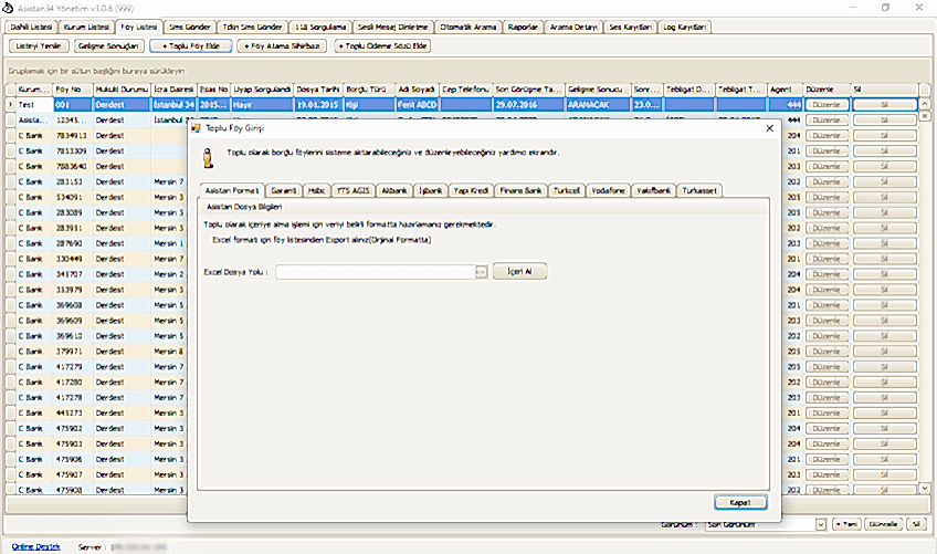 Bütünleşik bir sistem olan Asistan34 Call Center Müşteri Takip CRM yazılımı yüzlerce kurum ve binlerce dosya için dilerseniz tek tek dilerseniz toplu olarak kolayca işlem yapabilmenizi sağlar.